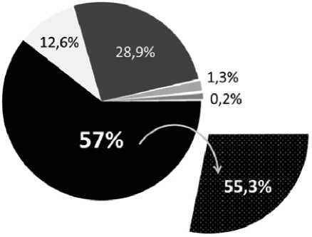 В ходе мониторинга сведений о распределении выпускников ОПОП в сфере ИИ по каналам занятости была предоставлена информация о 16013 выпускниках очной формы обучения 136 вузов. Две трети выпускников завершили обучение по образовательным программам бакалавриата – 61,2 %; 36,7 % – по программам магистратуры; 2,2 % – по программам специалитета. На рис. 2 показано распределение выпускников ОПОП в сфере ИИ 2024 года по каналам занятости.
