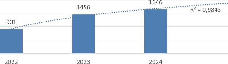 за 3 года, что свидетельствует о потребительском интересе. Построенная линия тренда на 2025 год свидетельствует о том, что спрос будет расти и в перспективе составит немногим менее 2000 человек с достоверностью аппроксимации 98,46 % (R2=0,9846).