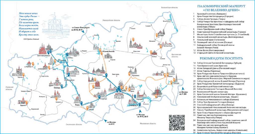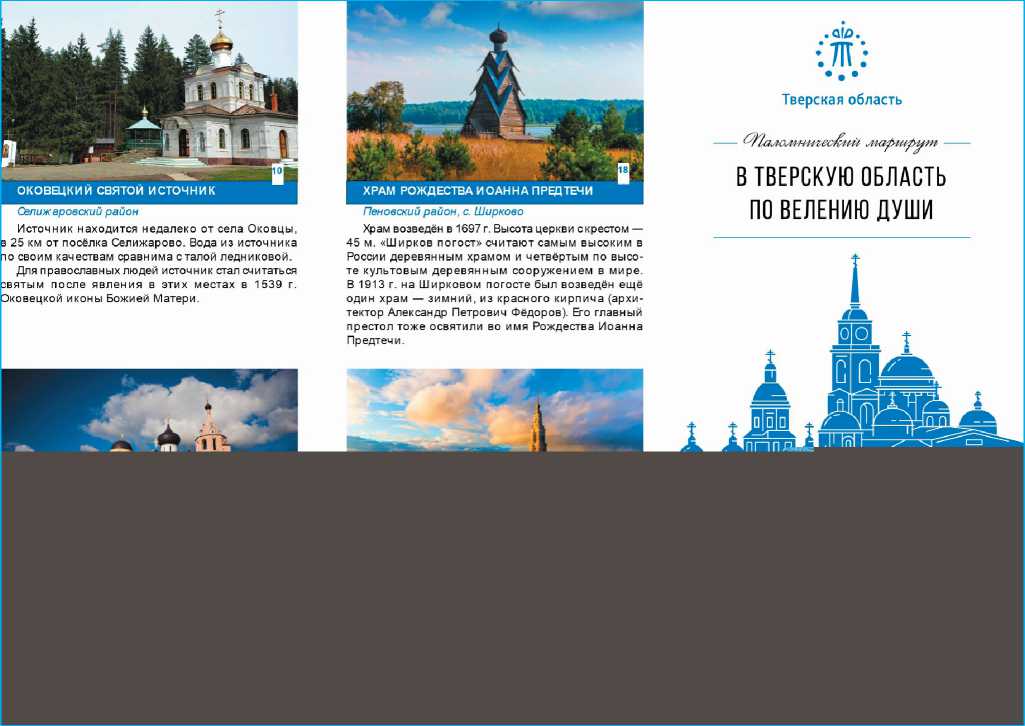 не только информацию о городах и объектах посещения на маршруте, но и основные достопримечательности религиозной направленности, расположенные вблизи посещаемых мест. Таким образом, туристы, путешествующие самостоятельно, могут, отклонившись от основного маршрута, посетить иные туристские аттракции с целью ознакомления и получения дополнительных впечатлений. Так, можно предположить, что в тематических изданиях уместно размещать дополнительную информацию, направленную на целевую аудиторию туристского маршрута для создания новой туристской мотивации. Туристское издание также размещено на туристическом портале Тверской области в электронной версии, а в классическом бумажном варианте доступно в отелях, музеях и ТИЦ по маршруту.