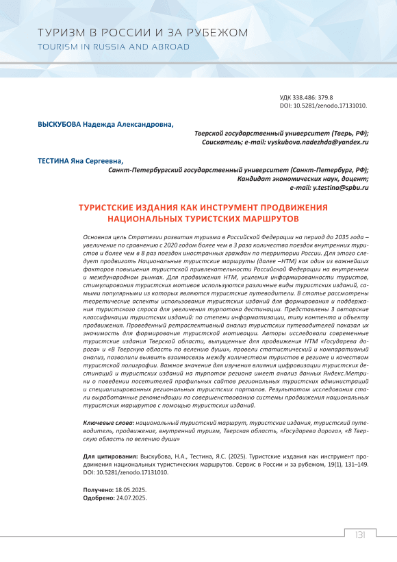 Основная цель Стратегии развития туризма в Российской Федерации на период до 2035 года – увеличение по сравнению с 2020 годом более чем в 3 раза количества поездок внутренних туристов и более чем в 8 раз поездок иностранных граждан по территории России. Для этого следует продвигать Национальные туристские маршруты (далее –НТМ) как один из важнейших факторов повышения туристской привлекательности Российской Федерации на внутреннем и международном рынках. Для продвижения НТМ, усиления информированности туристов, стимулирования туристских мотивов используются различные виды туристских изданий, самыми популярными из которых являются туристские путеводители. В статье рассмотрены теоретические аспекты использования туристских изданий для формирования и поддержания туристского спроса для увеличения турпотока дестинации. Представлены 3 авторские классификации туристских изданий: по степени информатизации, типу контента и объекту продвижения. Проведенный ретроспективный анализ туристских путеводителей показал их значимость для формирования туристской мотивации. Авторы исследовали современные туристские издания Тверской области, выпущенные для продвижения НТМ «Государева дорога» и «В Тверскую область по велению души», провели статистический и компаративный анализ, позволили выявить взаимосвязь между количеством туристов в регионе и качеством туристской полиграфии. Важное значение для изучения влияния цифровизации туристских дестинаций и туристских изданий на турпоток региона имеет анализ данных Яндекс.Метрики о поведении посетителей профильных сайтов региональных туристских администраций и специализированных региональных туристских порталов. Результатом исследования стали выработанные рекомендации по совершенствованию системы продвижения национальных туристских маршрутов с помощью туристских изданий.