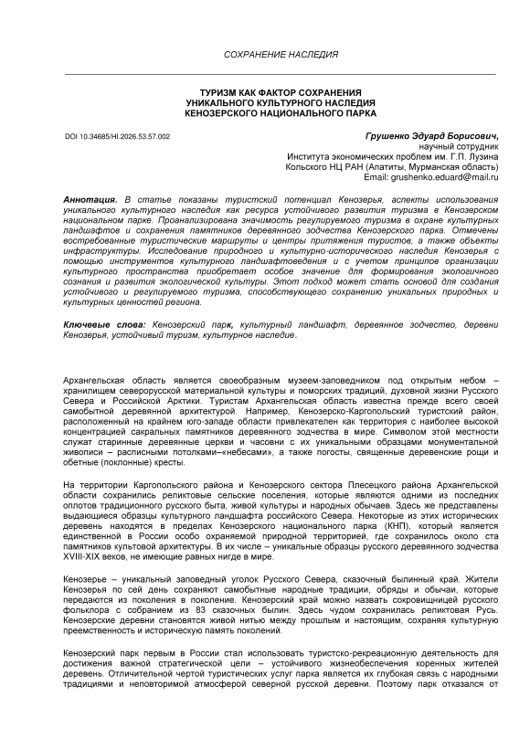 В статье показаны туристский потенциал Кенозерья, аспекты использования уникального культурного наследия как ресурса устойчивого развития туризма в Кенозерском национальном парке. Проанализирована значимость регулируемого туризма в охране культурных ландшафтов и сохранения памятников деревянного зодчества Кенозерского парка. Отмечены востребованные туристические маршруты и центры притяжения туристов, а также объекты инфраструктуры. Исследование природного и культурно-исторического наследия Кенозерья с помощью инструментов культурного ландшафтоведения и с учетом принципов организации культурного пространства приобретает особое значение для формирования экологичного сознания и развития экологической культуры. Этот подход может стать основой для создания устойчивого и регулируемого туризма, способствующего сохранению уникальных природных и культурных ценностей региона.