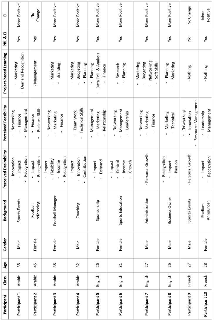 A series of ten interviews have been conducted, the purpose of which to explore the participants’ confidence in starting business, how project-based learning increases entrepreneurial intentions. Table 1 shows a summary of the participants' demographics and perceptions. In terms of gender, the sample included an equal number of male and female participants (five each), allowing for gender-balanced insights into entrepreneurial intentions and experiences with project-based learning. The participants ranged aged from 26 to 45 years, with an average age of approximately 33.8 years. Regarding professional backgrounds, the interviewees came from a variety of sports-related sectors. These included coaching and technical roles (e.g., football manager, coach), sports education and officiating (e.g., sports education specialist, football referee), business and sponsorship (e.g., business owner, sponsorship officer), administration (e.g., sports events, sports administration), and media-related roles (e.g., stadium announcer). This diversity contributed to a richer understanding of how project-based learning impacted students with different professional trajectories and goals.