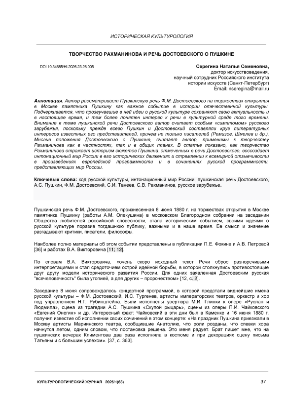 Автор рассматривает Пушкинскую речь Ф.М. Достоевского на торжествах открытия в Москве памятника Пушкину как важное событие в истории отечественной культуры. Подчеркивается, что прозвучавшие в ней идеи о русской культуре сохраняют свою актуальность и в настоящее время, и тем более понятен интерес к речи в культурной среде того времени. Внимание к теме пушкинской речи Достоевского автор считает особым «симптомом» русского зарубежья, поскольку прежде всего Пушкин и Достоевский составляли круг литературных интересов известных его представителей, причем не только писателей (Ремизов, Шмелев и др.). Многие положения Достоевского о Пушкине, считает автор, применимы к творчеству Рахманинова как в частностях, так и в общих планах. В статье показано, как творчество Рахманинова отражает историзм сюжетов Пушкина, отмеченных в речи Достоевского, воссоздает интонационный мир России в его исторических движениях и стремлении к всемирной отзывчивости в произведениях европейской программности и в сочинениях русской программности, представляющих мир России.