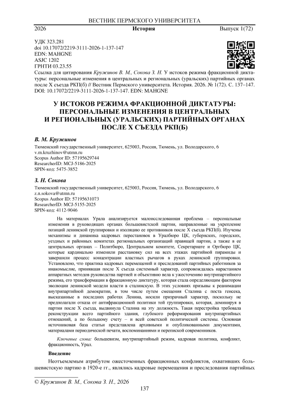 The article analyzes a little-studied issue based on materials from the Urals—personal changes in the governing bodies of the Bolshevik Party aimed at strengthening the positions of Lenin's faction and isolating its opponents after the 10th Congress of the RCP(b). The mechanisms and dynamics of personnel reshuffles in the Ural Bureau of the Central Committee, provincial, city, county, and district committees of regional party organizations, as well as in its central bodies—the Politburo, Central Committee, Secretariat, and Orgburo of the Central Committee—are examined. These changes radically altered the balance of power at all levels of the party hierarchy and completed the process of concentrating power levers in the hands of Lenin's faction. It is established that the practice of personnel movements and persecution of party workers for dissent, which acquired a systematic character after the 10th Congress, was accompanied by an increase in bureaucratic methods of party management. This objectively led to the tightening of the intra-party regime, transforming it into a factional dictatorship, which became a defining factor in the evolution of Lenin's model of power into Stalin's. Under these conditions, calls for the revival of intra-party democracy, including through Stalin's removal from the post of General Secretary, as expressed in Lenin's later works, were illusory. These proposals did not imply a rejection of the "anti-factional" policy pursued by the faction dominating the party after the 10th Congress, which had advanced Stalin to this position. Such restructuring would have required a reconstruction of the entire party structure, profound reform of the entire system of intra-party relations, and, fundamentally, of the entire Soviet political system. The primary source base of the article consists of archival and published documents, materials from the periodical press, memoirs, and correspondence of contemporaries.
