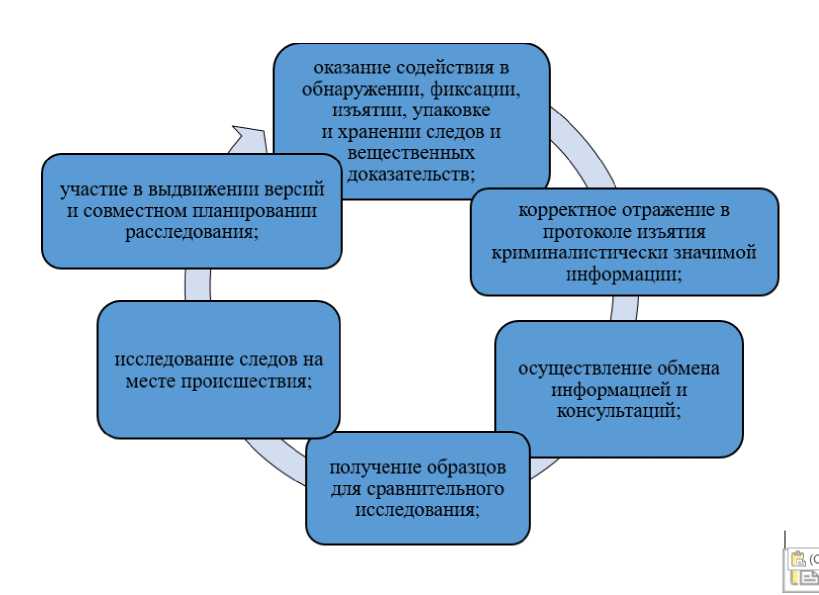 Несмотря на то, что среди представителей научной общественности нет единого мнения относительно содержательного аспекта указанной формы реализации специальных знаний при производстве следственных действий, приемлемым видится подход, который наиболее полно охватывает возможные интерпретации участия специалиста при производстве следственных действий в рамках нормативно-правового поля, которые представлены на схеме № 2 [8].