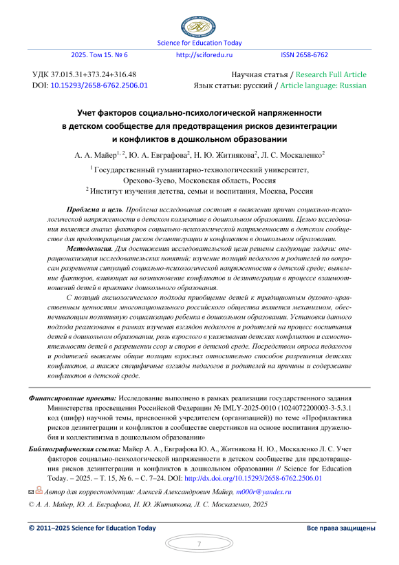 Учет факторов социально-психологической напряженности в детском сообществе для предотвращения рисков дезинтеграции и конфликтов в дошкольном образовании