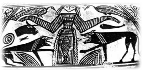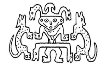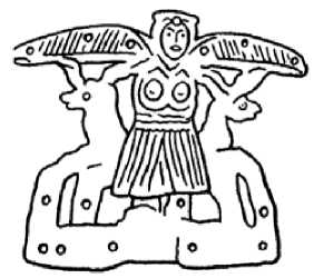 Социальная семантика трехчастной композиции. Так называемая трехчастная композиция, в которой главную женскую фигуру удерживают по обеим сторонам две второстепенные, имеет крайне широкое распространение в традиционном декоративно-прикладном искусстве. Многие исследователи обращались к этому орнаментальному мотиву с целью его интерпретации. Центральный женский персонаж обычно связывают с образом Великой Богини, Матери Мира, Владычицы зверей и людей. Она в разные времена и в разных культурах изображалась по-своему: крылатой, рогатой, змееногой, нередко в позе роженицы или же душащей животных и птиц, находящихся по обе ее стороны (рис. 1).
