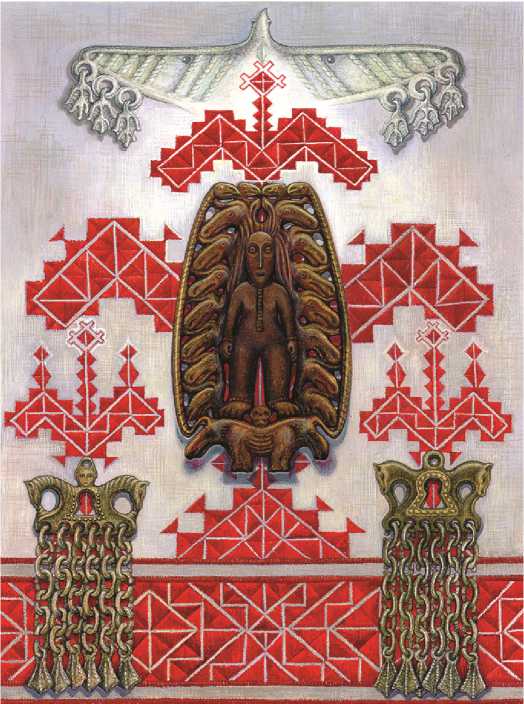На свадебном поясе удмуртская богиня Кылдысин скрепляет священным браком два рода, представленных здесь родовыми деревьями. Стволы этих деревьев образованы М-образными фигурами, напоминающими крылья птицы. Эти знаки расположены один над другим, как фигурки рождающих женщин на неолитических петроглифах. Каждая М-образная птица в данном случае символизирует жизнь одного поколения, в целом же ствол родового дерева – это смена поколений, цепочка рождений и смертей. Удмуртская богиня попала в вышивку с древних шаманских пластин Прикамья и металлических коньковых подвесок средневекового костюма (рис. 2). На свадебном поясе она по-прежнему олицетворяет собой единство двух родов. Цельность вышитой фигуры богини восстанавливалась только тогда, когда пояс был надет на невесту, именно с этого момента два «чужих» рода скреплялись брачными узами. Невеста, как богиня, объединяла их, обещая продолжить жизнь двух родов в потомстве. В конфликтных ситуациях на меже, разделявшей родовые территории, удмурты проводили обряд, в котором разрывали пояс «зар», что означало полный разрыв всех отношений26. Разрывали пояс так, что два родовых дерева навсегда отделялись один от другого. Так простые неграмотные женщины, бессознательно воспроизводя в вышивках первообразы глубокой древности, донесли до нас священную историю своих предков, они держали в своих руках нить народной традиции, как богини-покровительницы прядения – нить судьбы.