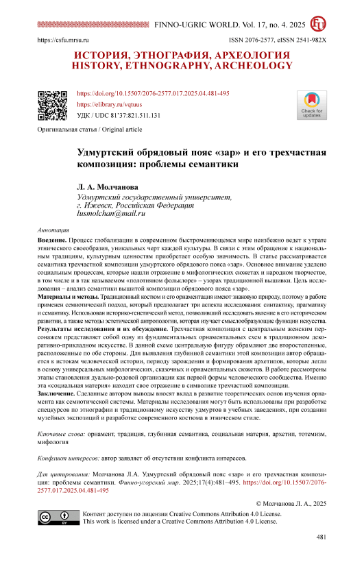 Введение. Процесс глобализации в современном быстроменяющемся мире неизбежно ведет к утрате этнического своеобразия, уникальных черт каждой культуры. В связи с этим обращение к национальным традициям, культурным ценностям приобретает особую значимость. В статье рассматривается семантика трехчастной композиции удмуртского обрядового пояса «зар». Основное внимание уделено социальным процессам, которые нашли отражение в мифологических сюжетах и народном творчестве, в том числе и в так называемом «полотняном фольклоре» ‒ узорах традиционной вышивки. Цель исследования – анализ семантики вышитой композиции обрядового пояса «зар». Материалы и методы. Традиционный костюм и его орнаментация имеют знаковую природу, поэтому в работе применен семиотический подход, который предполагает три аспекта исследования: синтактику, прагматику и семантику. Использован историко-генетический метод, позволивший исследовать явление в его историческом развитии, а также методы эстетической антропологии, которая изучает смыслообразующие функции искусства. Результаты исследования и их обсуждение. Трехчастная композиция с центральным женским персонажем представляет собой одну из фундаментальных орнаментальных схем в традиционном декоративно-прикладном искусстве. В данной схеме центральную фигуру обрамляют две второстепенные, расположенные по обе стороны. Для выявления глубинной семантики этой композиции автор обращается к истокам человеческой истории, периоду зарождения и формирования архетипов, которые легли в основу универсальных мифологических, сказочных и орнаментальных сюжетов. В работе рассмотрены этапы становления дуально-родовой организации как первой формы человеческого сообщества. Именно эта «социальная материя» находит свое отражение в символике трехчастной композиции. Заключение. Сделанные автором выводы вносят вклад в развитие теоретических основ изучения орнамента как семиотической системы. Материалы исследования могут быть использованы при разработке спецкурсов по этнографии и традиционному искусству удмуртов в учебных заведениях, при создании музейных экспозиций и разработке современного костюма в этническом стиле.