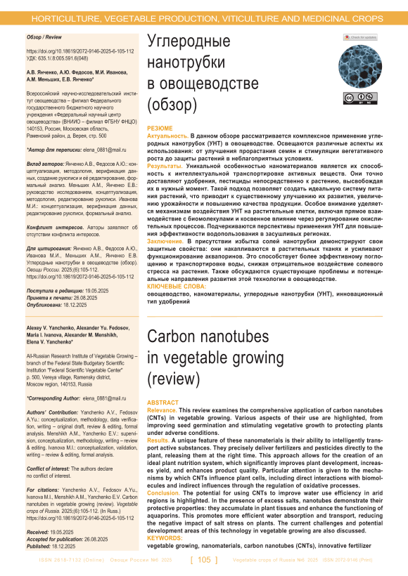 Актуальность. В данном обзоре рассматривается комплексное применение углеродных нанотрубок (УНТ) в овощеводстве. Освещаются различные аспекты их использования: от улучшения прорастания семян и стимуляции вегетативного роста до защиты растений в неблагоприятных условиях. Результаты. Уникальной особенностью наноматериалов является их способность к интеллектуальной транспортировке активных веществ. Они точно доставляют удобрения, пестициды непосредственно к растению, высвобождая их в нужный момент. Такой подход позволяет создать идеальную систему питания растений, что приводит к существенному улучшению их развития, увеличению урожайности и повышению качества продукции. Особое внимание уделяется механизмам воздействия УНТ на растительные клетки, включая прямое взаимодействие с биомолекулами и косвенное влияние через регулирование окислительных процессов. Подчеркиваются перспективы применения УНТ для повышения эффективности водопользования в засушливых регионах. Заключение. В присутствии избытка солей нанотрубки демонстрируют свои защитные свойства: они накапливаются в растительных тканях и усиливают функционирование аквапоринов. Это способствует более эффективному поглощению и транспортировке воды, снижая отрицательное воздействие солевого стресса на растения. Также обсуждаются существующие проблемы и потенциальные направления развития этой технологии в овощеводстве.