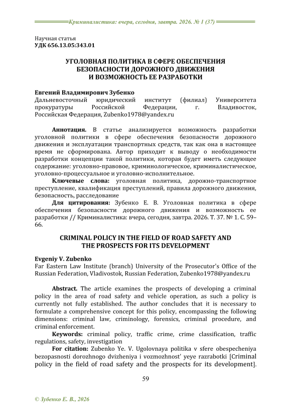 The article analyzes the possibility of developing a criminal policy in the field of road safety and vehicle operation, as it is currently not formed. The author concludes that it is necessary to develop a concept of such a policy, which will have the following content: criminal law, criminology, forensic science, criminal procedure, and criminal enforcement.