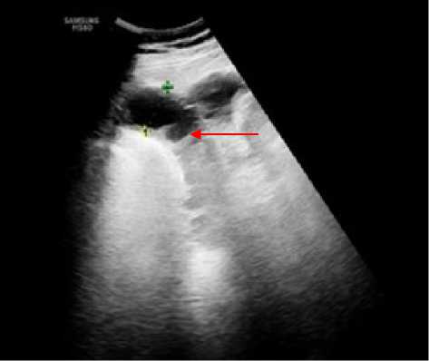 В поздние сроки (7–21 сутки) в трёх случаях лоцировался фрагмент тонкой кишки с отёком стенки пониженной эхогенности с мелкими гиперэхогенными включениями в структуре – пузырьками газа (рис. 3).