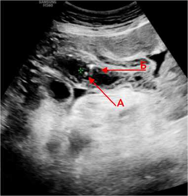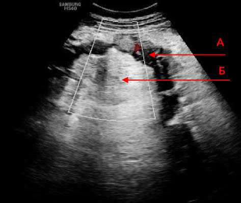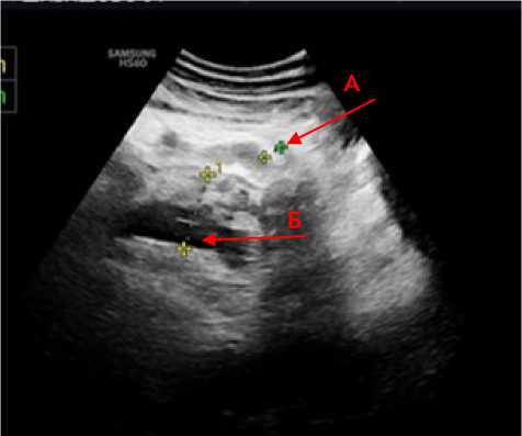 Рисунок 2. Эхограмма фрагмента тонкой кишки ( А ), распластанной на инфильтрированной брыжейке ( Б ) – воспалительный инфильтрат с вовлечением брыжейки и фрагмента тонкой кишки Figure 2. Echogram of a fragment of the small intestine ( A ), spread on the infiltrated mesentery ( Б ) – inflammatory infiltrate involving the mesentery and a fragment of the small intestine