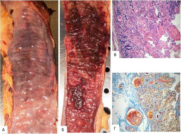 Гистологически в одних участках толстой кишки преобладают острые сосудистые изменения с кровоизлияниями в слизистой оболочке, некрозом поверхностного эпителия и крипт в толстой кишке, в других завершённый некроз слизистой оболочки с полным нарушением строения, клеточным детритом на поверхности с отторжением последнего и формированием эрозивно-язвенных дефектов при наличии фибриновых тромбов кровеносных сосудов слизистой оболочки и подслизистой основы (рис. 6, В–Г).