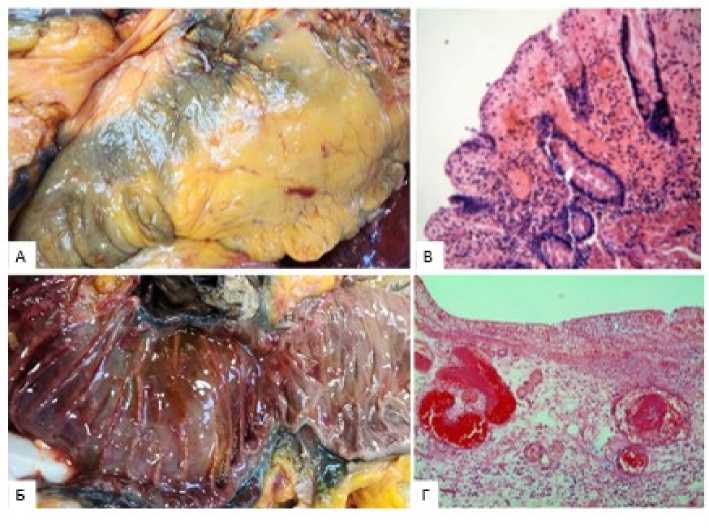 Figure 5. Macroscopic (A, Б) and histological (В, Г) changes in the small intestine in pancreatic necrosis: A – large-focal cyanotic surface of the serous layer; Б – focal hemorrhages with disruption of the structure of the mucosal folds (MM); В – diffuse hemorrhages in the proper layer of the MM, incomplete necrosis, hematoxylin and eosin staining, ×200 magnification; Г – complete disruption of the structure of the intestinal villi, thrombi in the vessels of the MM and submucosa, MSB staining, ×200 magnification