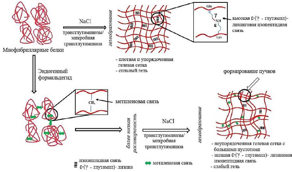 В процесс гелеобразования вовлечены многие ферменты, которые оказывают положительное или отрицательное влияние на структуру геля. Например, эндогенная транс- глутаминаза, присутствующая в сурими, может катализировать реакцию ацильного переноса между ε-аминогруппами остатков лизина и γ-карбоксиамидными группами остатков глутамина на тяжелых цепях миозина, что приводит к образованию ε-(γ-глутамил)-лизиновых связей между белками, ответственных за явление «схватывания» и высокую эластичность геля конечных продуктов [3]. Кроме того, учеными отмечено, что хотя эндогенная трансглутаминаза усиливает гелеобразование и укрепляет сеть геля, образуя несульфидные ковалентные связи между миозинами, сохраняются проблемы с получением удовлетворительных свойств геля, возможно, из-за Ca2+-зависимых характеристик активации и потери активности в процессе производства сурими [4].