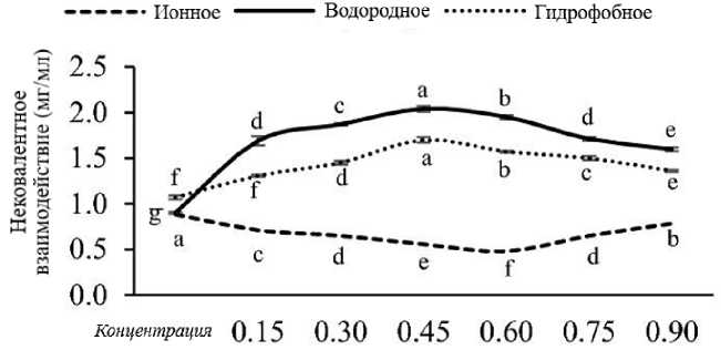 Трехмерная структура белкового геля состоит из различных нековалентных взаимодействий, в основном ионных связей, водо- родных связей и гидрофобных взаимодействий. Хотя все нековалентные взаимодействия, такие как ионные связи, водородные связи и гидрофобные взаимодействия, значительно различались (p < 0,05) при различных концентрациях PPE, однако большее количество водородных связей (2,04 ± 0,03 мг/мл) и гидрофобных взаимодействий (1,70 ± 0,03 мг/мл) было обнаружено в геле сурими, обогащенном 0,45 % PPE (рис. 2).