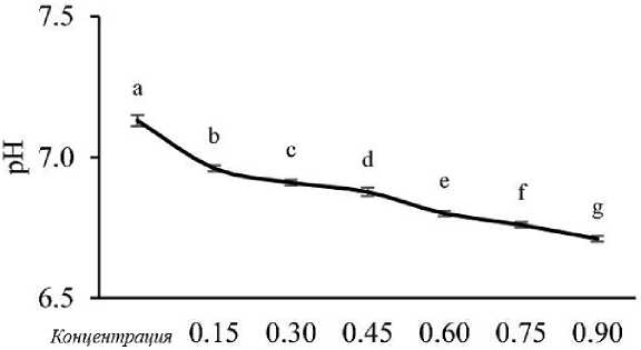 В случае ионных взаимодействий количество уменьшилось от контроля до 0,60 % уровня РРЕ, а затем увеличилось и достигло уровня контроля (0,88 ± 0,02 мг/мл). В данном исследовании рН в контроле составил 7,13 ± 0,02, который постепенно снижался с увеличением концентрации РРЕ (рис. 3).