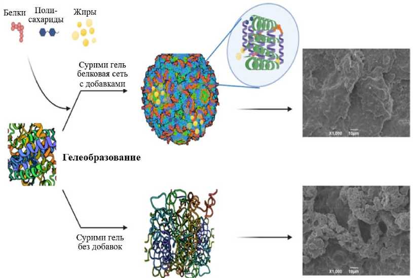 Сегодня количество коммерческих гелевых продуктов растет благодаря использованию различных добавок, таких как моносахариды, олигосахариды, полисахариды и гидролизаты на основе белков. Добавление этих ингредиентов улучшает желирующие свойства геля сурими различными способами: а) предотвращая окисление, денатурацию и агрегацию белков; б) улучшая межмолекулярное взаимодействие; в) усиливая сшивку аминокислот и г) уменьшая количество свободных молекул воды в процессе обработки и хранения [5].