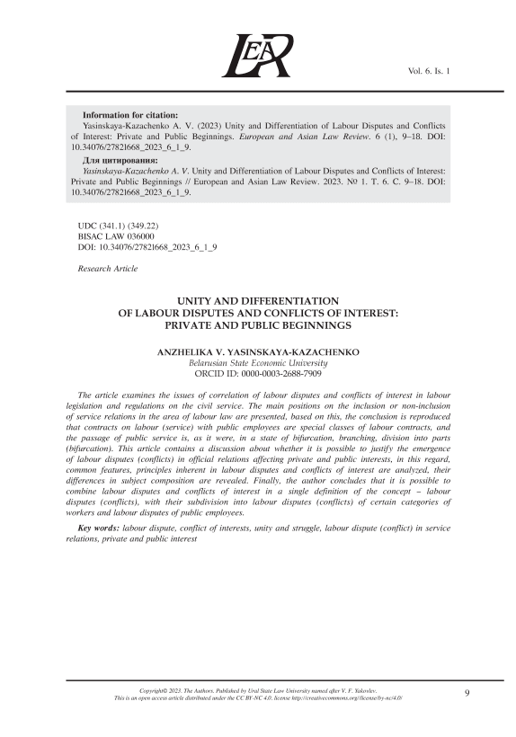 The article examines the issues of correlation of labour disputes and conflicts of interest in labour legislation and regulations on the civil service. The main positions on the inclusion or non-inclusion of service relations in the area of labour law are presented, based on this, the conclusion is reproduced that contracts on labour (service) with public employees are special classes of labour contracts, and the passage of public service is, as it were, in a state of bifurcation, branching, division into parts (bifurcation). This article contains a discussion about whether it is possible to justify the emergence of labour disputes (conflicts) in official relations affecting private and public interests, in this regard, common features, principles inherent in labour disputes and conflicts of interest are analyzed, their differences in subject composition are revealed. Finally, the author concludes that it is possible to combine labour disputes and conflicts of interest in a single definition of the concept – labour disputes (conflicts), with their subdivision into labour disputes (conflicts) of certain categories of workers and labour disputes of public employees.