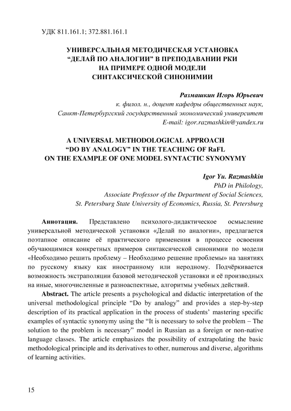 Представлено психолого-дидактическое осмысление универсальной методической установки «Делай по аналогии», предлагается поэтапное описание её практического применения в процессе освоения обучающимися конкретных примеров синтаксической синонимии по модели «Необходимо решить проблему – Необходимо решение проблемы» на занятиях по русскому языку как иностранному или неродному. Подчёркивается возможность экстраполяции базовой методической установки и её производных на иные, многочисленные и разноаспектные, алгоритмы учебных действий. Ключевые слова: универсальная методическая установка; русский язык как иностранный; синтаксическая синонимия; лексико-грамматическая координация; методические приёмы; учебные цели; дидактика. Universal methodological approach "Do by analogy" in teaching Russian as a foreign language on the example of one model of syntactic synonymy. Abstract. The article presents a psychological and didactic interpretation of the universal methodological principle “Do by analogy” and provides a step-by-step description of its practical application in the process of students’ mastering specific examples of syntactic synonymy using the “It is necessary to solve the problem – The solution to the problem is necessary” model in Russian as a foreign or non-native language classes. The article emphasizes the possibility of extrapolating the basic methodological principle and its derivatives to other, numerous and diverse, algorithms of learning activities. Keywords: universal methodological approach; Russian as a foreign language; syntactic synonymy; lexical-grammatical coordination; methodological techniques; educational goals; didactics. Выходные данные публикации: Размашкин И. Ю. Универсальная методическая установка "Делай по аналогии" в преподавании РКИ на примере одной модели синтаксической синонимии // Актуальные проблемы общественных наук. Научная сессия профессорско-преподавательского состава, научных сотрудников и аспирантов по итогам НИР за 2024 год: Сборник научных трудов. – СПб: Изд-во СПбГЭУ, 2025. – С. 15 – 24. – EDN KHCFDF. Сборник: Актуальные проблемы общественных наук. Научная сессия профессорско-преподавательского состава, научных сотрудников и аспирантов по итогам НИР за 2024 год: Сборник научных трудов / под ред. С. И. Тягунова, К. А. Ермилова. – СПб.: Изд-во СПбГЭУ, 2025. – 107 с. ISBN 978-5-7310-6918-2 For citation: Razmashkin I. Yu. Universal methodological approach "Do by analogy" in teaching Russian as a foreign language on the example of one model of syntactic synonymy // Actual problems of social sciences. Scientific session of professors, researchers and postgraduate students based on the results of research in 2024: Collection of scientific papers. – St. Petersburg: St. Petersburg State Economic University, 2025. – Pp. 15 – 24. In Collection: Actual Problems of Social Sciences. Scientific Session of Professors, Researchers and Postgraduate Students on the Results of Research in 2024: Collection of Scientific Papers / Edited by S. I. Tyagunov and K. A. Yermilov. – St. Petersburg: St. Petersburg State University of Economics, 2025. – 107 p. ISBN 978-5-7310-6918-2