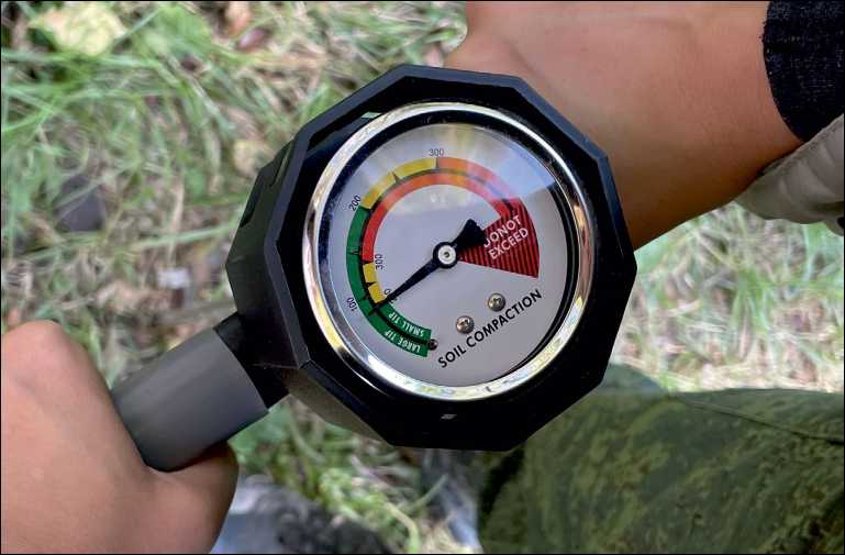 Зона зеленого цвета в диапазоне значений прибора соответствует плотности 0–14 кг/см2, что соответствует благоприятным условиям прорастания растительности; зона желтого цвета эквивалентна плотности 15–21 кг/см2 (приемлемые условия произрастания растительности); зона красного цвета соответствует плотности от 22 кг/ см2 и выше и представляет очень неблагоприятные условия прорастания растительности.