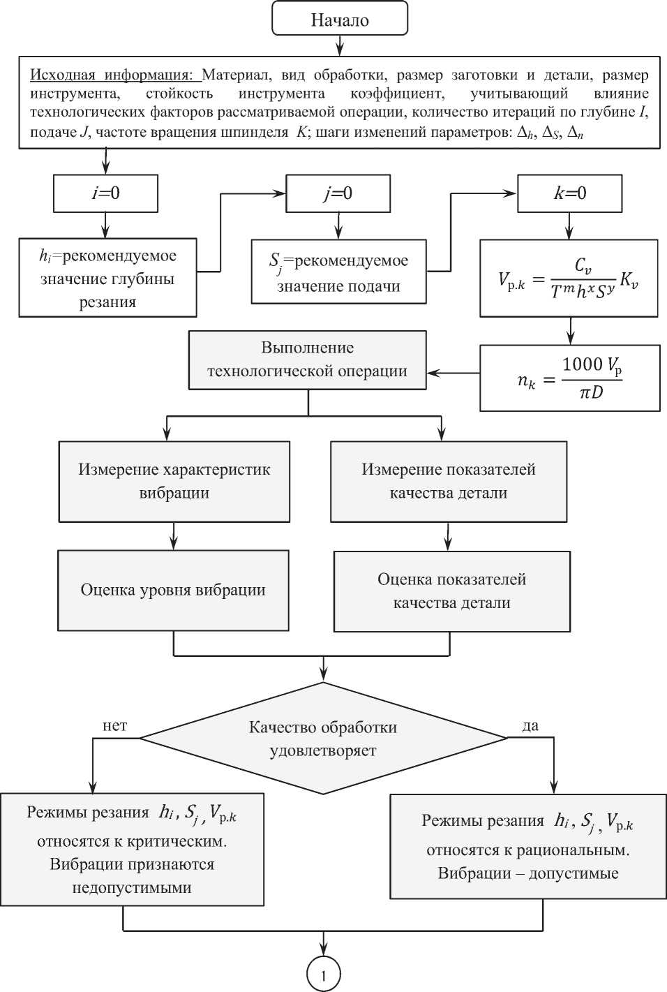 Вибрации необходимо измерять в процессе обработки на рабочих режимах. Далее устанавливается взаимосвязь режимов резания и вибрации на данном конкретном станке. В зависимости от выполнения требований по качеству режимы резания считаются рациональными, вибрации при данных режимах обработки – допустимыми (если все требования выполняются), в противном случае, когда хотя бы по одному из параметров качества требования не выполняются, режимы обработки признаются критическими, вибрации недопустимыми.