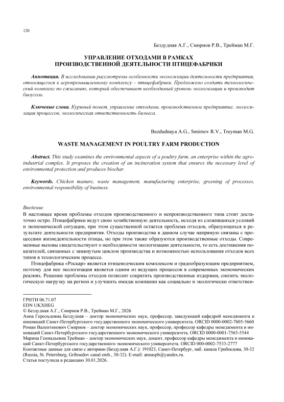 В исследовании рассмотрены особенности экологизации деятельности предприятия, относящегося к агропромышленному комплексу – птицефабрики. Предложено создать технологический комплекс по сжиганию, который обеспечивает необходимый уровень экологизации и производит биоуголь.