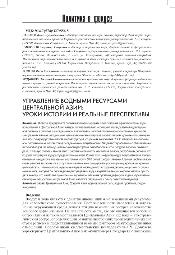 Управление водными ресурсами Центральной Азии: уроки истории и реальные перспективы
