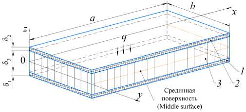 Note: q - normal load distributed over the entire surface of the inner layer; a - plate length; b - plate width; 0 - origin; x, y, z - coordinate axes; 8 1 - thickness of the outer layer of the plate; 8 2 - thickness of the inner layer of the plate; δ 3 – thickness of the middle layer.
