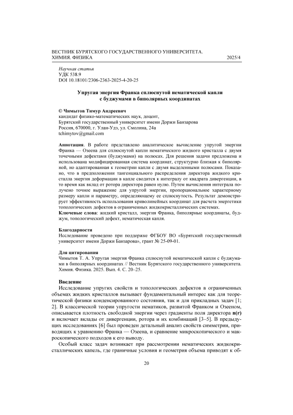 Чимытов Т. А. Упругая энергия Франка сплюснутой нематической капли с буджума-ми в биполярных координатах // Вестник Бурятского государственного университета. Химия. Физика. 2025. Вып. 4. С. 20–25.
