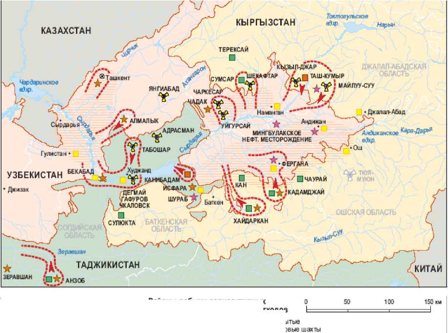 Места добычи и переработки урана в этих странах ЦА расположены на горных территориях над долиной трансграничной реки Сырдарья – одного из основных источников питьевого водоснабжения данного региона, проходящей по территории Кыргызстана, Узбекистана, Таджикистана и Казахстана, часто на берегу водных объектов и рядом с населёнными пунктами. Природные катаклизмы – землетрясения, сели, наводнения – могут привести к разрушению тел хвосто-хранилищ и загрязнению радионуклидами р. Сырдарья, что приведёт к экологической катастрофе трансграничного масштаба.