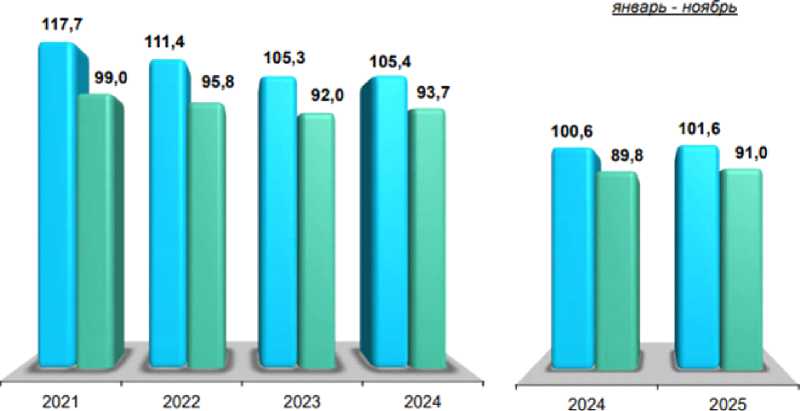 Рассматривая уровень преступности в сфере экономики как один из показателей состояния экономической безопасности, обратимся к данным уголовной статистики, представленной на сайте МВД России, за январь - ноябрь 2025 по преступлениям экономической направленности, которых выявлено на 1,1%, чем в аналогичный период прошлого года, и составило 101,6 тыс. преступлений, при этом тяжкие и особо тяжкие преступления в общем числе выявленных преступлений экономической направленности составили 68,2%. Динамику экономической преступности в нашей стране можно увидеть на рисунке 1.
