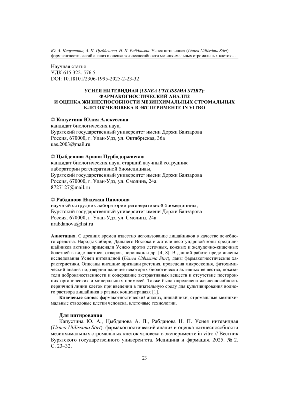 Уснея нитевидная (Usnea Utilissima Stirt): фармакогностический анализ и оценка жизнеспособности мезинхимальных стромальных клеток человека в эксперименте in vitro