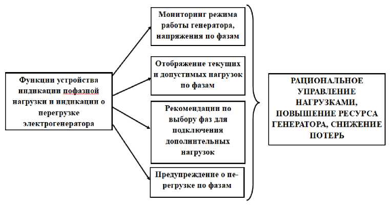 Требования к устройству включают в себя необходимый функционал и условия эксплуатации. Разрабатываемое устройство мониторинга и индикации пофазной загрузки и перегрузки генераторов малой мощности УМЗЭГ используется следующим способом (рисунок 1). С помощью соответствующих датчиков контролируют ток и напряжение на выводах генератора и мощность по фазам, определяют наличие несимметрии по току, напряжению и нагрузке, выделяют наиболее и наименее нагруженные фазы. Отображают допустимые ток, напряжение и мощность по фазам, фактические ток, напряжение и мощность по фазам, степень загрузки фаз, возможную и рекомендуемую свободные мощности нагрузки по фазам, осуществляют световую индикацию о недопустимой несимметрии по фазам, световую и звуковую индикацию о перегрузке по фазам. На основе указанной информации принимают решение о перераспределении нагрузки, при подключении дополнительной однофазной нагрузки определяют на какую фазу её рационально подключить [9].