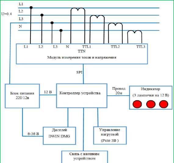 На рисунке 2 приведена структурная схема разрабатываемого устройства [10]. Принцип работы следующий. Трансформаторы тока и напряжения подключаются к фазам генератора и считывают данные, которые с помощью модуля измерения передаются на дисплей. Дисплей показывает персоналу полученные значения. Индикатор показывает допустимую нагрузку на генератор. Связь с внешним устройством осуществляется через канал связи «RS-485». Запитываются все комплектующие с помощью блока питания 220/12/5В (стабилизатор напряжения). Так же в устройстве устанавливаются реле для управления нагрузкой. Все комплектующие связываются и взаимодействуют между собой с помощью контроллера «STM 32» [10].