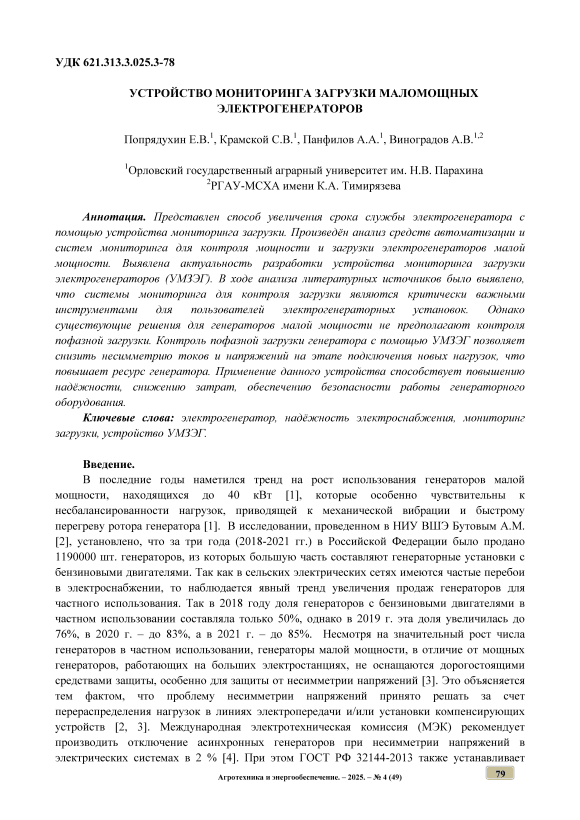 В последние годы наметился тренд на рост использования генераторов малой мощности, находящихся до 40 кВт [1], которые особенно чувствительны к несбалансированности нагрузок, приводящей к механической вибрации и быстрому перегреву ротора генератора [1]. В исследовании, проведенном в НИУ ВШЭ Бутовым А.М. [2], установлено, что за три года (2018-2021 гг.) в Российской Федерации было продано 1190000 шт. генераторов, из которых большую часть составляют генераторные установки с бензиновыми двигателями. Так как в сельских электрических сетях имеются частые перебои в электроснабжении, то наблюдается явный тренд увеличения продаж генераторов для частного использования. Так в 2018 году доля генераторов с бензиновыми двигателями в частном использовании составляла только 50%, однако в 2019 г. эта доля увеличилась до 76%, в 2020 г. – до 83%, а в 2021 г. – до 85%. Несмотря на значительный рост числа генераторов в частном использовании, генераторы малой мощности, в отличие от мощных генераторов, работающих на больших электростанциях, не оснащаются дорогостоящими средствами защиты, особенно для защиты от несимметрии напряжений [3]. Это объясняется тем фактом, что проблему несимметрии напряжений принято решать за счет перераспределения нагрузок в линиях электропередачи и/или установки компенсирующих устройств [2, 3]. Международная электротехническая комиссия (МЭК) рекомендует производить отключение асинхронных генераторов при несимметрии напряжений в электрических системах в 2 % [4]. При этом ГОСТ РФ 32144-2013 также устанавливает значения для несимметрии напряжений (коэффициентов несимметрии напряжений по обратной последовательности и по нулевой последовательности) не более 2 % в течение 95 % времени интервала в одну неделю и 4 % - в течение 100 % времени [4]. Таким образом, разработка новых экономически эффективных решений проблемы несимметрии напряжений является актуальной задачей.