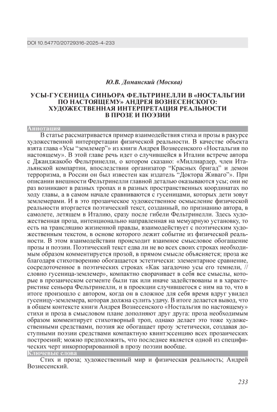 В статье рассматривается пример взаимодействия стиха и прозы в ракурсе художественной интерпретации физической реальности. В качестве объекта взята глава «Усы “землемер”» из книги Андрея Вознесенского «Ностальгия по настоящему». В этой главе речь идет о случившейся в Италии встрече автора с Джанджакобо Фельтринелли, о котором сказано: «Миллиардер, член Итальянской компартии, впоследствии организатор “Красных бригад” и демон терроризма, в России он был известен как издатель “Доктора Живаго”». При описании внешности Фельтринелли главной деталью оказываются усы, они не раз возникают в разных тропах и в разных пространственных координатах по ходу главы, а в самом начале сравниваются с гусеницами, которых дети зовут землемерами. И в это прозаическое художественное осмысление физической реальности вторгается поэтический текст, созданный, по признанию автора, в самолете, летящем в Италию, сразу после гибели Фельтринелли. Здесь художественная проза, интенционально направленная на мемуарную установку, то есть на трансляцию жизненной правды, взаимодействует с поэтическим художественным текстом, в основе которого лежит событие из физической реальности. В этом взаимодействии происходит взаимное смысловое обогащение прозы и поэзии. Поэтический текст едва ли не во всех своих строках необходимым образом комментируется прозой, в прямом смысле объясняется, проза же благодаря стихотворению обогащается эстетически: элементарное сравнение, сосредоточенное в поэтических строках «Как загадочно усы его темнели, // словно гусеница-землемер», компактно сворачивает в себя все смыслы, которые в прозаическом сегменте были так или иначе задействованы и в характеристике сеньора Фельтринелли, и в проекции случившегося с ним на то, что в итоге произошло с автором, когда он в сложное для себя время вдруг увидел гусеницу-землемера, которая должна сулить удачу. В итоге делается вывод, что в общем контексте книги Андрея Вознесенского «Ностальгия по настоящему» стихи и проза в смысловом плане дополняют друг друга: проза необходимым образом комментирует стихотворный троп, однако делает это тоже художественными средствами, поэзия же обогащает прозу эстетически, создавая доступными поэзии средствами компактную квинтэссенцию всех прозаических построений, можно предположить, что последнее является одной из специфических черт инкорпорированной в прозу поэзии вообще.
