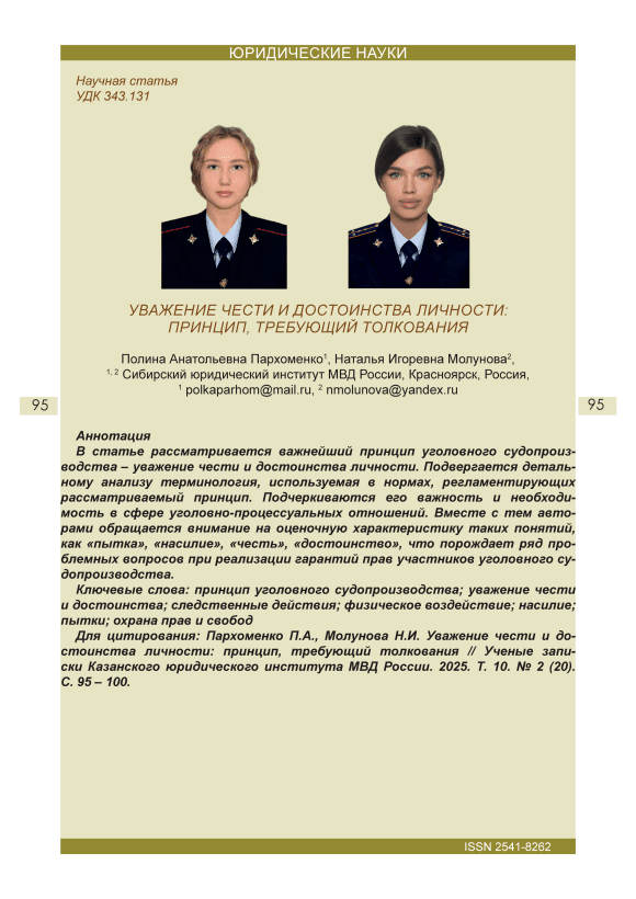 Принцип уважения чести и достоинства личности, закреплённый в ст. 9 УПК РФ, находит своё практическое применение на всех этапах уголовного судопроизводства. Это отражено в многочисленных процессуальных нормах (например, ч. 3 ст. 161, ч. 4 ст. 179, ч. 7 ст. 182, ч. 3 ст. 184, ч. 2 ст. 202, п. 3 ч. 2 ст. 241 УПК РФ) и других законодательных актах, таких как Федеральный закон «О содержании под стражей подозреваемых и обвиняемых в совершении пре- ступлений» и др. Можно ли считать меры пресечения, такие как заключение под стражу, задержание, привод, принудительное освидетельствование или взятие образцов крови, формами насилия или пытки в рамках уголовного процесса? Этот сложный вопрос требует отдельного, детального анализа.