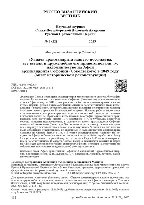 Статья посвящена реконструкции малоизвестного эпизода биографии первого Туркестанского архиепископа Софонии (Сокольского) — его паломничества на Афон в августе 1849 г., совершенного в бытность архимандритом и настоятелем церкви Русской дипломатической миссии в Константинополе. Цель исследования — восстановить обстоятельства поездки и выявить ее влияние на характер будущего первого архиерея Туркестанской епархии. Новизна работы заключается в использовании для реконструкции хода паломнической поездки источников, к которым доселе не обращались исследователи биографии Туркестанского архипастыря, хотя восточные письма П. А. Вяземского и А. Н. Муравьева достаточно хорошо известны исследователям, в отличие от писем архимандрита Софонии святителю Иннокентию (Борисову). Эти источники позволяют уточнить как даты, так и маршрут паломничества, а также имена спутников. Установлено, что поездка была отдельным путешествием, не связанным с паломничеством архимандрита Софонии на Святую Землю в 1850 г. В статье реконструирован маршрут его поездки по Афону: отбытие из Константинополя 4 августа 1849 г., прибытие в Лавру 7 августа, посещение Иверона 8 августа, Ватопеда и Кареи 9–10 августа, возвращение в Константинополь 15 августа. Сделан вывод о значимости событий и встреч на Афоне для духовной биографии святителя Софонии, несмотря на отсутствие его собственных письменных свидетельств об этом путешествии.