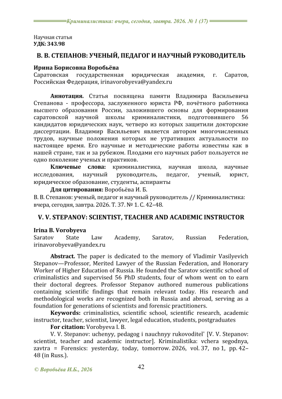 The paper is dedicated to the memory of Vladimir Vasilyevich Stepanov – professor, Merited Lawyer of the RF and Honorary Higher Education Worker of Russia, who has laid the foundations of the Saratov scientific school of criminalistics and prepared 56 candidates of law sciences; four of those have defended their doctoral dissertations. Vladimir Vasilyevich is known as the author of numerous publications, with the scientific statements that haven’t lost their relevance up to the present. His research and methodical papers are known both, in our country and abroad. The fruits of his work have been used by several generations of scientists and practicing criminalists.