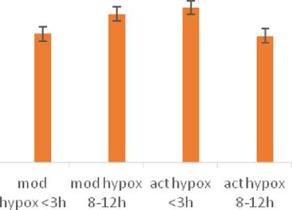 Figure 1. Haematocrit values (%) of H. fossilis under control and upon exposures to short (<3h) and long (8-12h) exposures of moderate and acute hypoxia conditions. Error bars indicate 95% confidence interval.