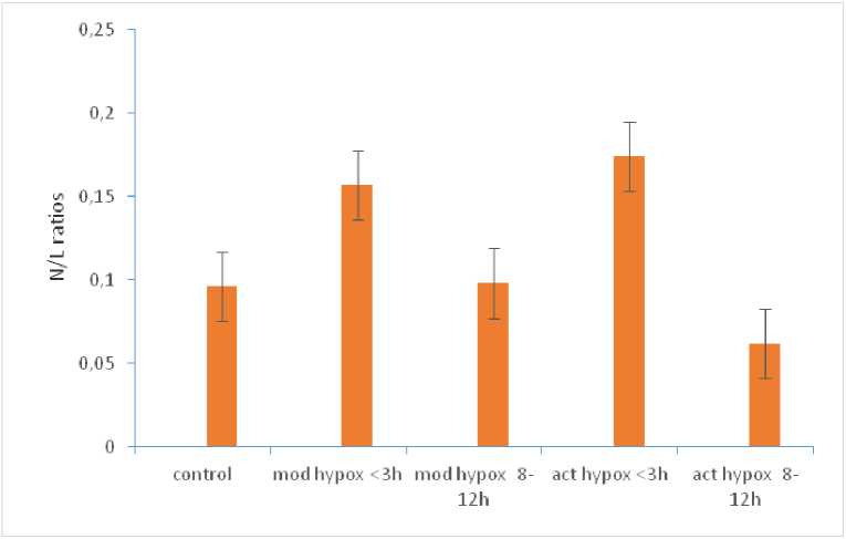 Figure 2. N/L ratios of H. fossilis under control and upon exposures to short (<3h) and long (8-12h) exposures of moderate and acute hypoxia conditions. Error bars indicate 95% confidence interval.