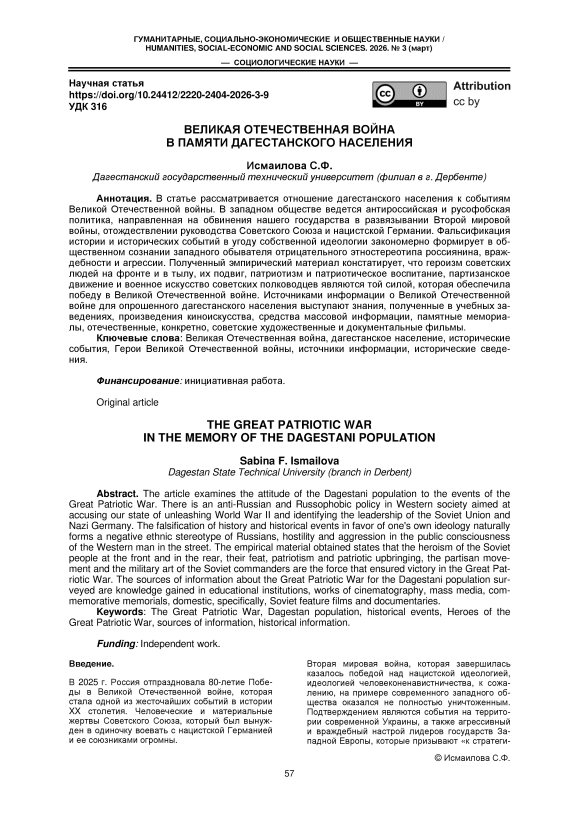The article examines the attitude of the Dagestani population to the events of the Great Patriotic War. There is an anti-Russian and Russophobic policy in Western society aimed at accusing our state of unleashing World War II and identifying the leadership of the Soviet Union and Nazi Germany. The falsification of history and historical events in favor of one's own ideology naturally forms a negative ethnic stereotype of Russians, hostility and aggression in the public consciousness of the Western man in the street. The empirical material obtained states that the heroism of the Soviet people at the front and in the rear, their feat, patriotism and patriotic upbringing, the partisan movement and the military art of the Soviet commanders are the force that ensured victory in the Great Patriotic War. The sources of information about the Great Patriotic War for the Dagestani population surveyed are knowledge gained in educational institutions, works of cinematography, mass media, commemorative memorials, domestic, specifically, Soviet feature films and documentaries.