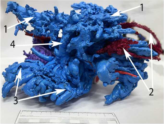 Рисунок 2 – Вены таза и тазовой конечности сеголетка байкальской нерпы (инъекция вен полиуретановой пеной): 1 – пенис; 2 – хвост; 3 – прямая кишка; 4 – плантарные плюсневые вены;