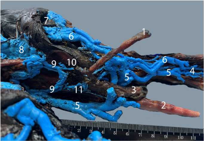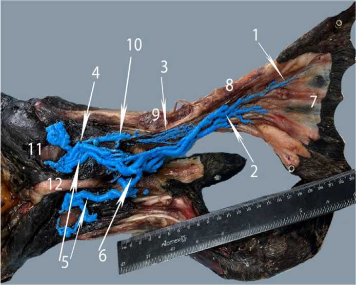Рисунок 4 – Вены тазовой конечности неполовозрелой байкальской нерпы (инъекция полиуретановой пеной): 1 –плантарная пальцевая вена; 2 – плантарная плюсневая вена; 3 – венозное сплетение; 4 – ветви задней большеберцовой вены; 5 – задняя большеберцовая вена; 6 – венозный анастомоз; 7 – пальцы; 8 – плюсна; 9 – заплюсневый сустав; 10 – передняя большеберцовая вена; 11 – семенник; 12 – пенис