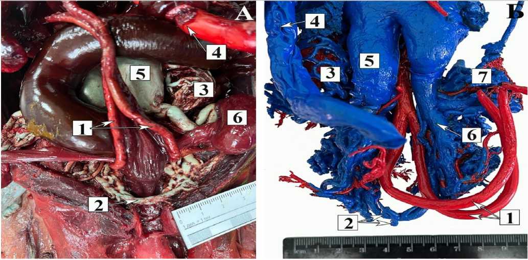 Рисунок 3 – Вены стволов каудальной полой вены новорожденных нерп (А – препарирование с предварительной инъекцией сосудов полиуретановой пеной, Б – коррозионный препарат). А: 1 – пупочные артерии; 2 – венозный анастомоз; 3 – венозное сплетение почек; 4 – пупочная вена; 5 – левый ствол каудальной полой вены; 6 – яичник. Б: 1 – пупочные артерии; 2 – венозный анастомоз с хвостовой веной; 3 – венозное сплетение почек; 4 – пупочная вена; 5 – правый