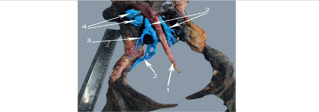 Рисунок 1 – Вены таза и каудальная часть эпидуральной вены половозрелой особи байкальской нерпы (коррозионный препарат): 1 – каудальная часть эпидуральной вены; 2 – запирательные вены; 3 – ветви поясничного коллектора; 4 – анастомоз поясничного коллектора с эпидуральной веной