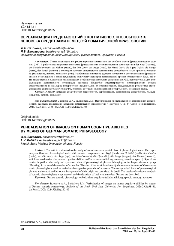 The article is devoted to the study of somatisms as a special class of phraseological units. The paper analyses German phraseological units with somatic components der Kopf (head), der Schädel (skull), das Gehirn (brain), das Ohr (ear), das Auge (eye), der Mund (mouth), die Lippe (lip), die Zunge (tongue), der Bauch (stomach), which are used to describe human cognitive abilities and/or processes (thinking, memory, attention, speech). Special attention is paid to the study and systematization of phraseological phrases belonging to the largest thematic group ‘Thinking’ in terms of the number of examples. The aim of the work is to identify the semantic features of German somatic phraseologisms used to verbalize the cognitive potential of a person. The metaphorical basis of phraseological phrases and cultural and historical background of their origin are considered in detail. The results of statistical analysis of somatic phraseologisms are presented, and the situations of their use in modern German are described.