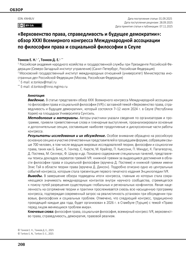 Введение. В статье представлен обзор ХХХI Всемирного конгресса Международной ассоциации по философии права и социальной философии (IVR) с заглавной темой «Верховенство права, справедливость и будущее демократии», который состоялся 7–12 июля 2024 г. в Сеуле (Республика Корея) на площадках Университета Сунгсиль. Методология и материалы. Авторы-участники указали сведения по организаторам и программе, привели приветственные слова и пленарные выступления, проанализировали основные и дополнительные секции, составившие наиболее продуктивные и дискуссионные части работы конгресса. Результаты исследования и их обсуждение. Особое внимание обращено на российскую основную секцию и участие отечественных представителей в прошедшем форуме, собравшем свыше 700 человек, в том числе ведущих мировых исследователей теории, философии и социологии права, таких как Б. Бикс, К. Гюнтер, С. Кирсте, М. Крайгер, П. Кьяссони, П. Миндус, К. Папагеоргиу, Д. Постема, М. Селлерс, Ф. Шауэр и др. Показано содержание специальных панелей, представлены тезисы докладов лауреатов премий IVR: книжной премии за выдающиеся достижения в области философии права и социальной философии (вручена Д. Постеме) и книжной премии имени Элис Тэй в области теории права (вручена Д. Диксон). Подробно описано одно из центральных событий конгресса, которым стала презентация первого печатного издания Энциклопедии IVR. Выводы. В завершение обзора подведены итоги конгресса, главным из которых стала сохраняющаяся значимость международных контактов внутри научного сообщества, стремящегося к поиску путей разрешения существующих глобальных и региональных конфликтов. Явная нацеленность на сопряжение теории и практики прослеживается сквозь всю насыщенную программу конгресса, подтверждая современный запрос на реалистичность установок при обсуждении правовых, философских и социальных проблем. Отмечено, что следующий конгресс, традиционно проходящий каждые два года, будет организован в 2026 г. в Стамбуле (Турция) с темой «Право перед лицом меняющихся проблем мира».